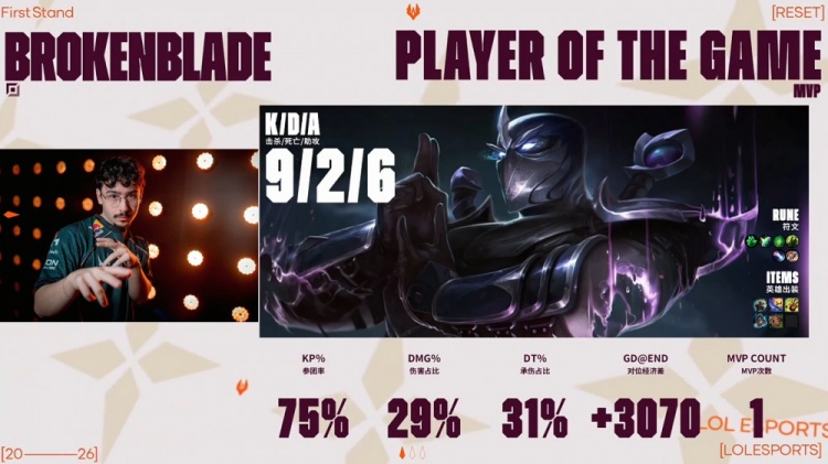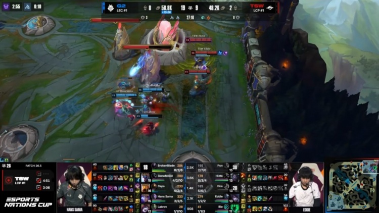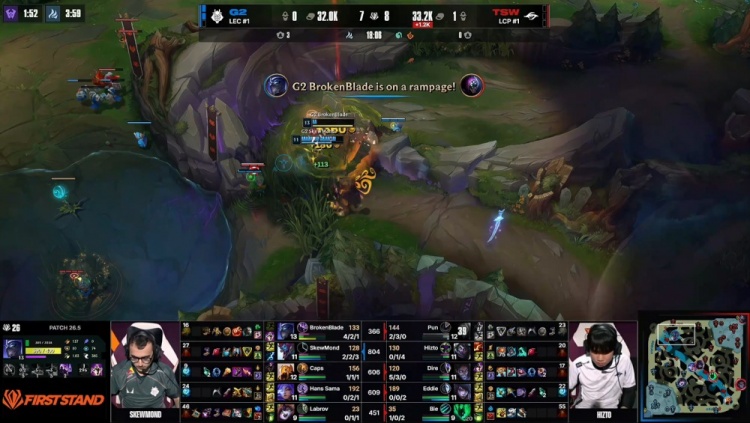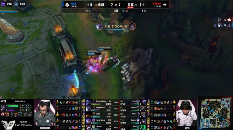 【26:19】G2中上推进拔掉TSW所有外塔,Pun贾克斯TP上路绕后被Caps沙皇融化,前者战绩来到2-7-0,G2冲上TSW高地推平基地拿到比赛胜利。