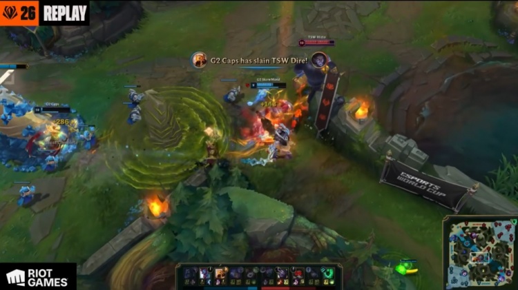 【15:19】Caps沙皇上路压线被抓,双方支援到位,G2三人残血拉开,Dire塞拉斯TP野区绕后杀掉SkewMond巨魔,TSW拿到先锋,经济领先2k。
