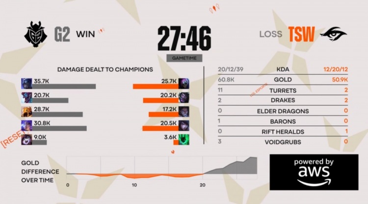 后期Dire塞拉斯上路被逮捕后,G2去开大龙,TSW四人接团反被打出0换3,G2吃掉大龙经济领先7k。最终G2推掉TSW所有外塔,Pun贾克斯上路绕后被Caps沙皇反杀,Pun战绩来到2-7-0,G2冲上高地推平TSW基地拿到比赛胜利。
