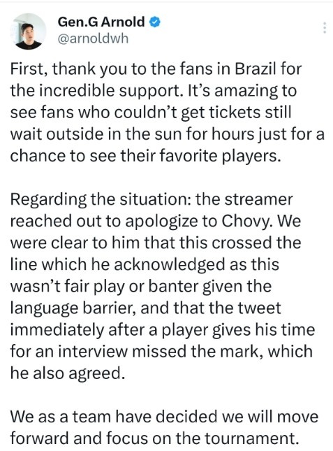 关于此事:主播已联系Chovy并致歉,我们明确告诉他,他的行为越界了,他也承认考虑到语言障碍,这种玩笑既不公平也不合 适。此外,在选手接受采访后立即发推文也是不妥的,他也同意这一点。