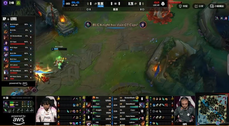 第三局G2选出女警+米利欧的下路组合,但是想配合SkewMond巨魔绕后gank结果自己直接送出线杀!Xun猴子gank帮助BLG下路组打出0换3,随后BLG下路再拿线杀,7分钟追杀到了对手下二塔,中路的knight阿卡丽更是两度对位单杀Caps阿狸!BLG在14分钟就把两队的经济差拉开到了8K!