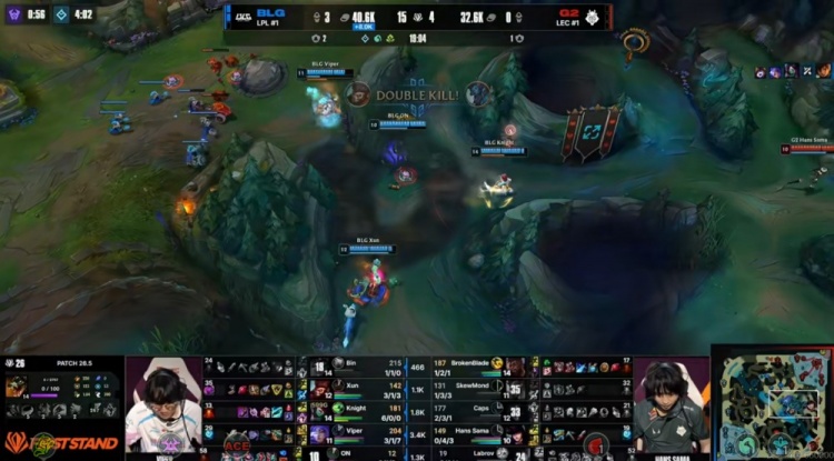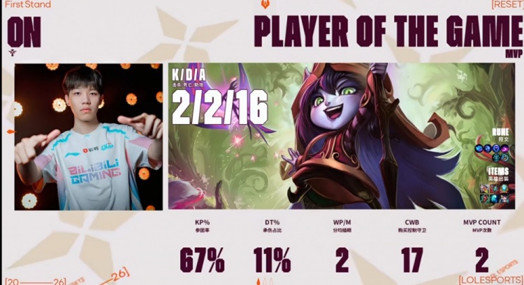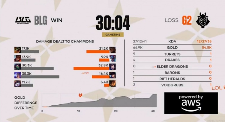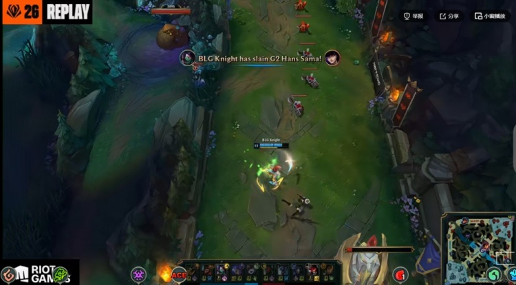 虽然中期BLG给机会送出四个终结赏金+关键小龙,但是BLG中路一波前后夹击0换3之后拿回比赛主动权,拿下大龙之后在龙魂团没再给机会,Xun猴子抢下龙魂之后knight阿卡丽开飞三杀收尾,自己25层书+14/1的KD结束比赛!BLG团灭对手,赢下本场BO5之后晋级到先锋赛的四强!