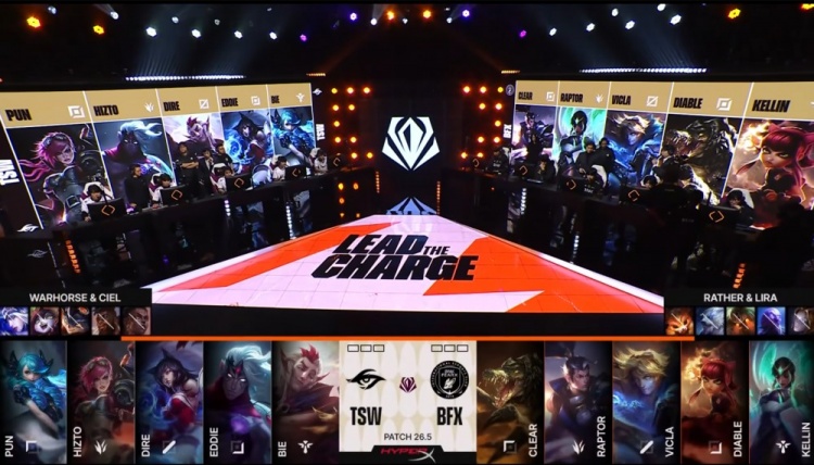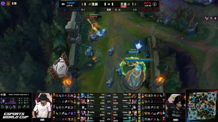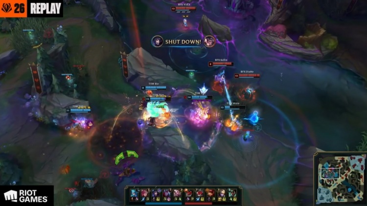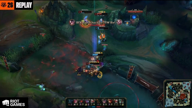 【26:06】中路团战,Clear鳄鱼又送到Dire狐狸嘴里,但Bie洛被Raptor赵信打残,自己W进F6被杀,BFX冲上TSW高地,Diable虐泉五杀,BFX轻松推平TSW基地先下一城。