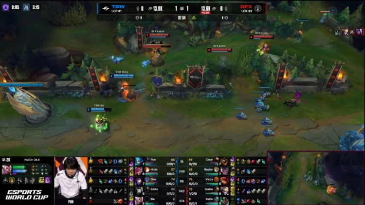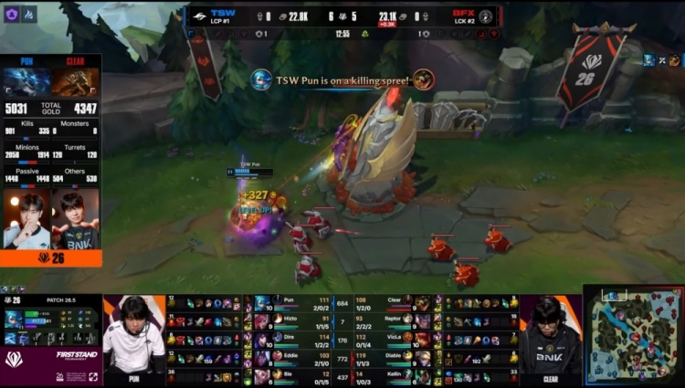 【19:58】BFX众人入侵TSW野区,Pun格温开剪配合Dire狐狸推进击杀BFX上野二人,TSW打出0换2,经济落后1k。