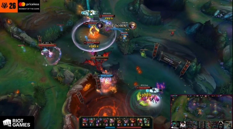 中期小龙团Raptor残血赵信双杀扳回劣势,BFX打出2换3吃掉小龙。随后Pun格温越塔单杀Clear鳄鱼后与队友再越掉Vicla安妮,但Raptor赵信上路同时单杀Dire狐狸。后续BFX拿到第三条小龙听牌火龙魂,小龙团Pun格温1v5大人头送给Vicla,BFX打出0换2经济领先2.3k。