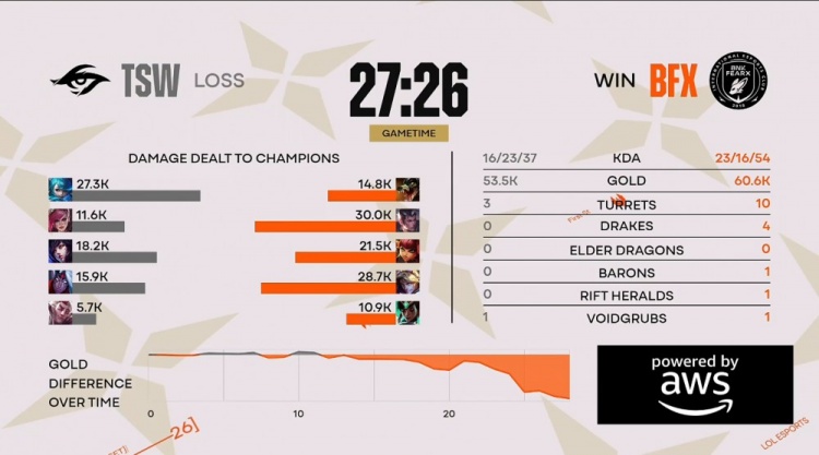 后续BFX入侵TSW野区反被打出0换2,大龙团Dire狐狸与队友脱节1v3送死,BFX打出1换4拿到大龙经济领先3k。龙魂团Vicla安妮拍脸融化Pun格温,BFX打出1换4推掉TSW中下两路二塔经济领先6k以上。最终Diable虐泉五杀,BFX轻松推平TSW基地先下一城。