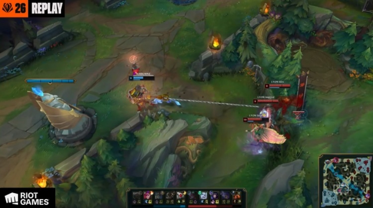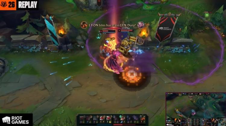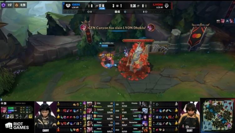 第二局前期Isles泰坦线上再次被GEN双人组线杀,LYON上单Dhokla阿萝拉先后被Canyon蔚与Kiin安蓓萨越塔单杀。随后LYON三越上遭Kiin反手1换2。