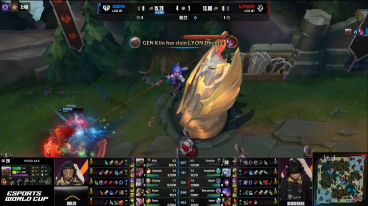 【25:10】GEN下路冲上LYON高地轻松打出1换4,一波推平LYON基地拿到赛点。