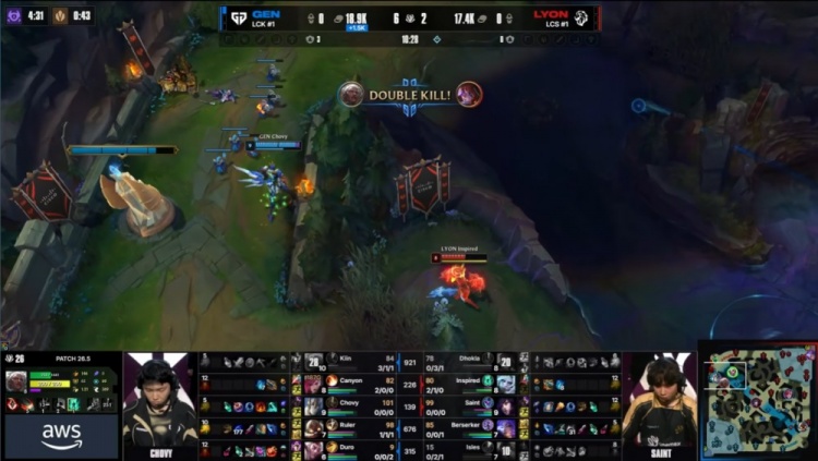 后续Kiin安蓓萨下路河道被LYON中野埋伏,Chovy加里奥英雄登场反杀Inspired,Saint难逃一死,GEN打出0换2放出先锋撞掉LYON一塔。
