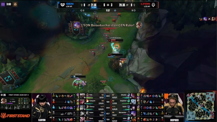 中期Berserker芸阿娜下路开大双杀GEN双人组被换,Canyon及时赶到双杀止损。小龙团后LYON三人追击逮捕Canyon,Saint狐狸拿到大人头,GEN经济优势收窄至1k以内。随后Kiin安蓓萨下路被Inspired佛耶戈砍掉,Inspired长驱直入带队再杀Duro洛与Ruler飞机,LYON打出0换3推掉GEN下路一塔经济领先2k。