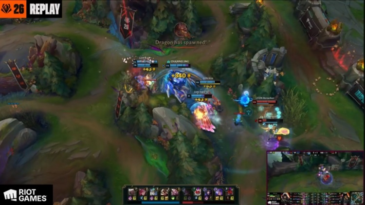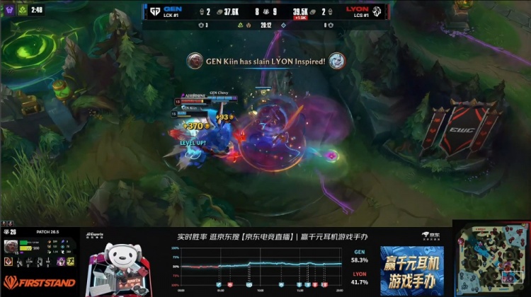 【22:53】GEN入侵LYON野区,inspired佛耶戈见面就被GEN集火击杀,lsles泰坦难逃一死,GEN打出0换2,五人回头吃掉大龙,经济反超3k。