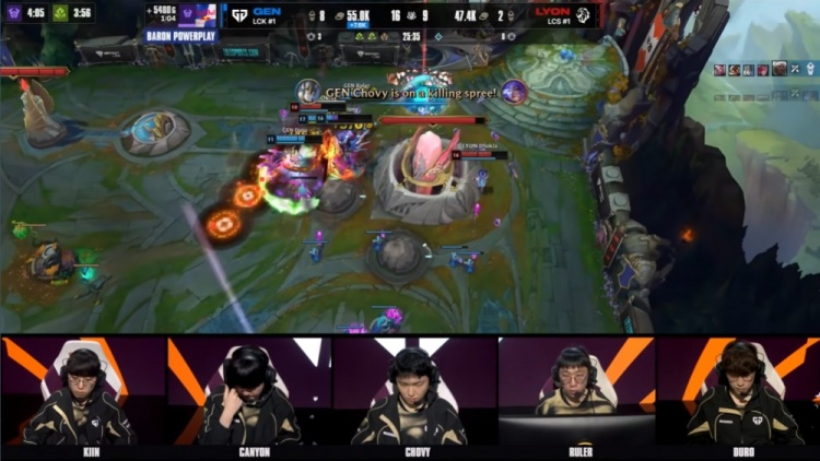 后期GEN入侵LYON野区击杀LYON野辅后轻松拿到大龙,最终GEN冲上LYON高地打出1换4,一波推平LYON基地拿到赛点。