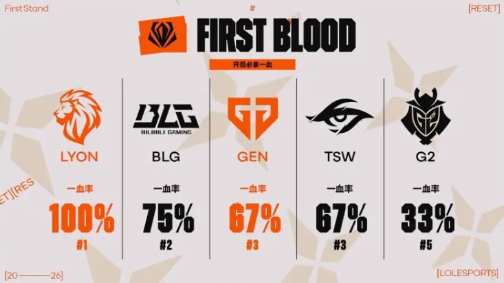 目前一血率前五的队伍,其中LYON位列第一,BLG和GEN紧随其后