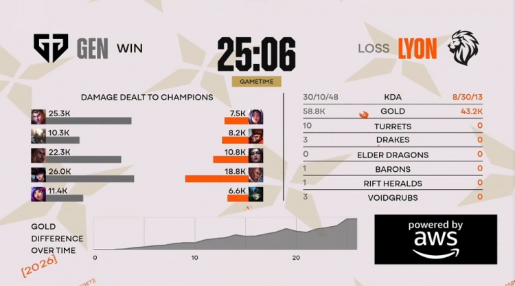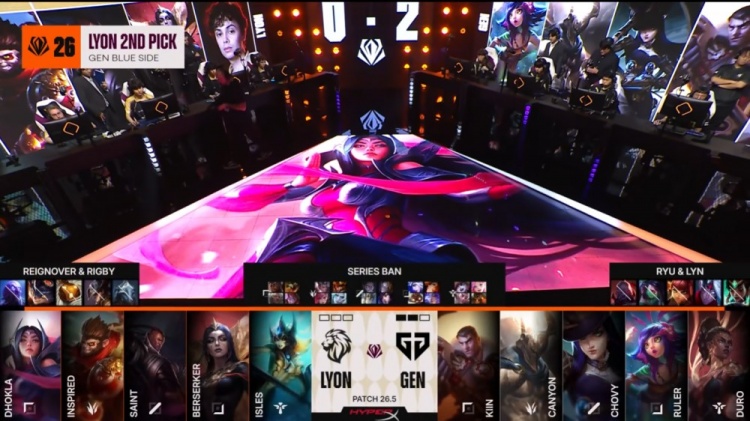 后期大龙团Canyon吃龙后单杀Saint妖姬,LYON正面不堪一击,GEN打出1换4经济优势超过1w。最终GEN冲上高地,Duro妮蔻反手开大击飞LYON两人,GEN打出0换3一波推平LYON基地拿到比赛胜利。