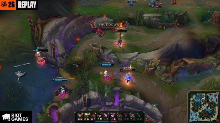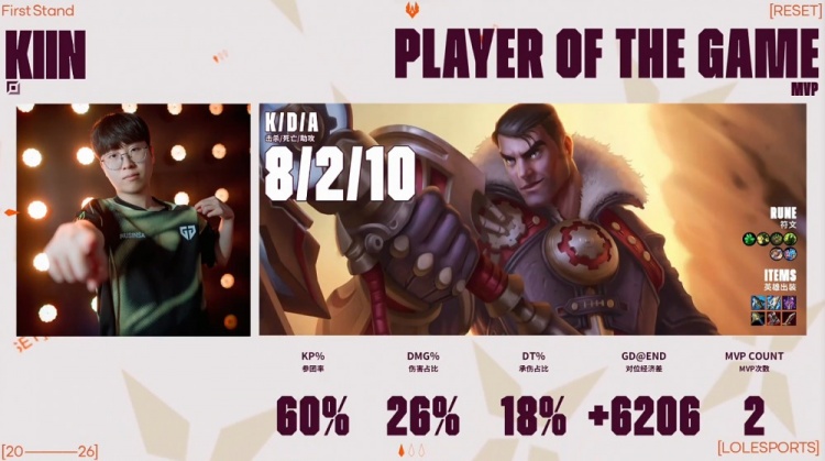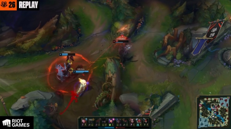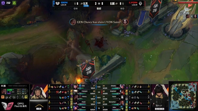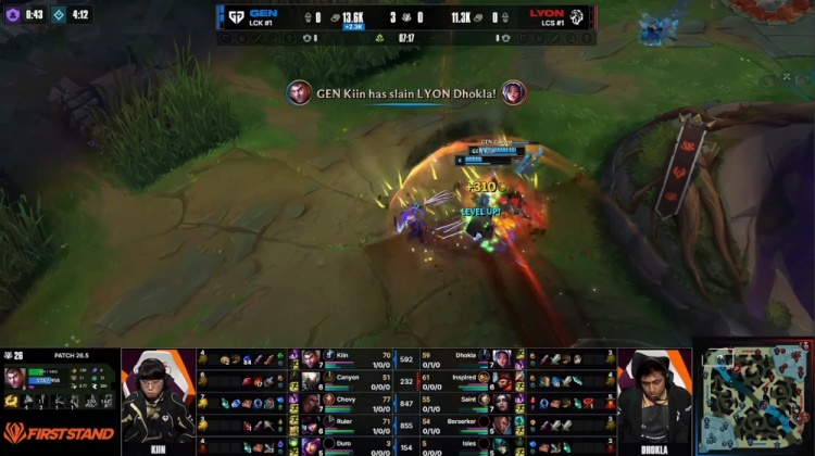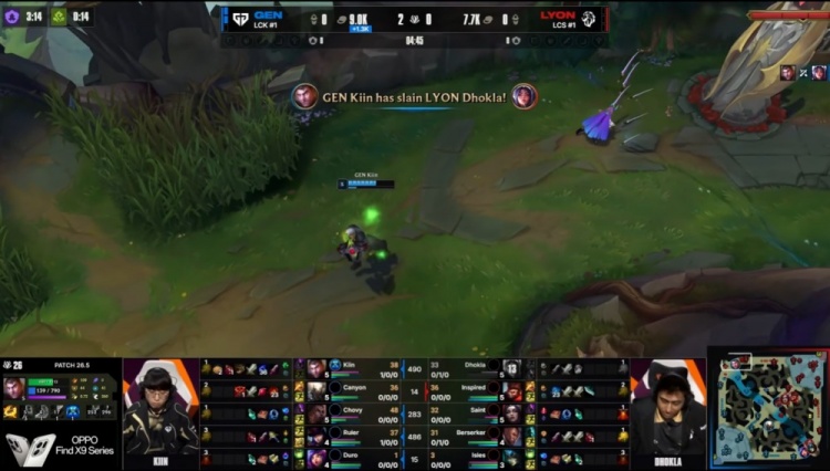 第三局前期Ruler女警线上一打三击杀Berserker卢锡安,Kiin杰斯与Chovy梅尔同时各自对位单杀,GEN三路线优。Canyon潘森随后配合Kiin多次击杀Dhokla女刀,后者战绩一路来到0-4。