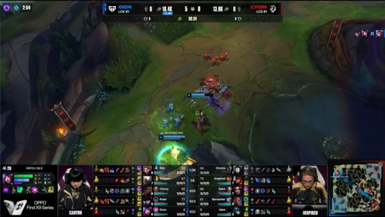 【23:18】GEN下路推进冲上LYON高地,Dhokla战绩来到0-8-2,大军压境,inspired猴子绕后被发现,GEN转中,Duro妮蔻反手开大击飞LYON两人,inspired猴子被杀,Dhokla战绩0-9-2,GEN打出0换3,一波推平LYON基地拿到比赛胜利。