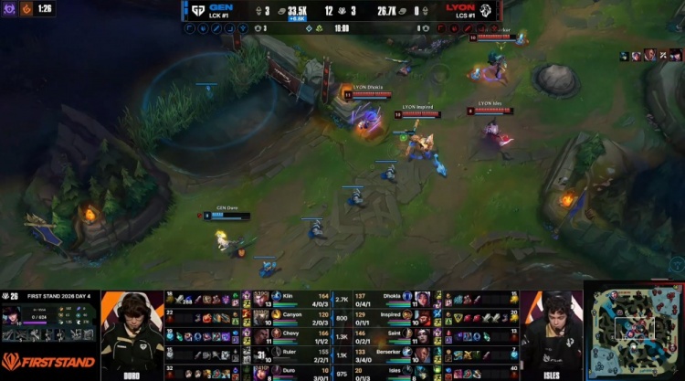 直播吧3月19日讯 2026全球先锋赛继续进行,B组胜者组决赛,LCK一号种子GEN横扫LCS一号种子LYON,晋级半决赛,LYON掉入败者组对阵JDG与LOUD的胜者。