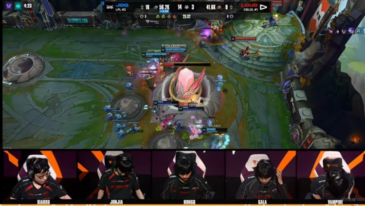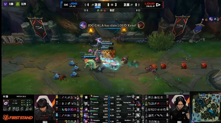 【18:40】LOUD交出双TP绕后包上但是第一时间没猜到JDG下路组的位置!Junjia赵信开大配合队友先秒中辅,残局JDG上中黏住了xyno奎桑提,最终GALA芸阿娜拿下击杀!这波JDG打出1换4,拆掉对手上二塔!9K经济差了!