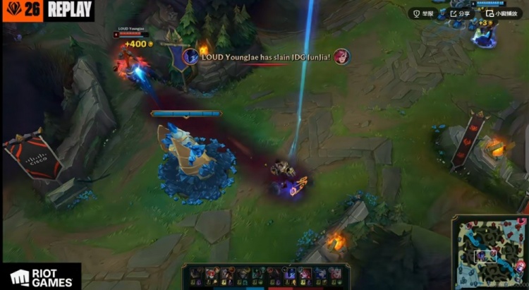 【12:15】Junjia蔚绕后配合下路组越塔完成对LOUD下路组的强杀!Junjia蔚双杀!JDG打出0换2,拆掉LOUD下路一塔!JDG经济优势接近4K!