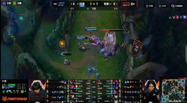 首局比赛JDG中下两路打出线优,YoungJae梦魇对位拿下一血之后连续gank上路强杀xiaoxu兰博!让Envy阿萝拉一度拿下3-0的开局!但是Junjia蔚一波gank下路导致LOUD下路直接被穿线,中期JDG稳扎稳打拿下三条小龙给到压力,龙魂团JDG上野合力解决掉YoungJae梦魇,GALA三杀之后帮助JDG海克斯龙魂+大龙全收!JDG带着超过一万的经济差直接高地秒掉Bull艾希,从上路一波解决战斗,先拿一分!