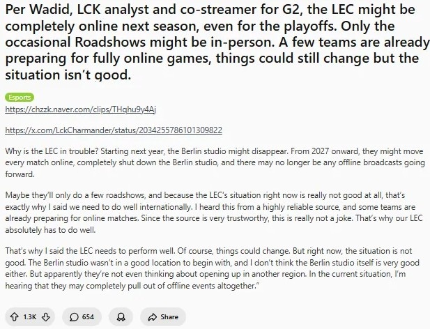 据LCK分析师、G2二路解说Wadid透露,LEC下个赛季可能会全面转为线上赛,甚至连季后赛也是如此。只有偶尔的大型赛事可能会在线下举行。少数几支队伍已经开始为全线上比赛做准备了,情况虽然还有转机,但目前形势不容乐观。