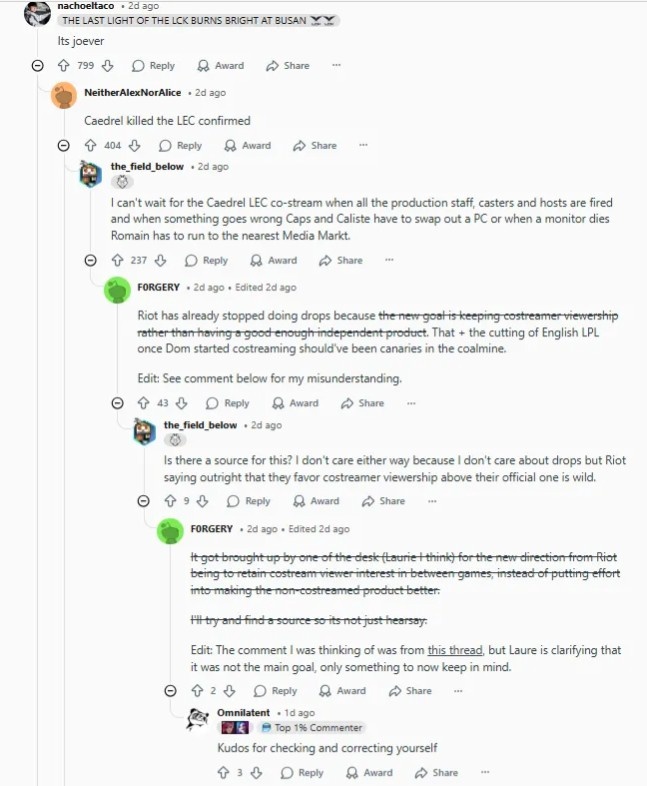 拳头早就停止发观赛掉落奖励了,因为他们的新目标是保住二路解说的收视率,而不是去做一个足够优秀的独立产品。(注:该句被划掉)这一点,再加上当初Dom开始做二路转播后,LPL的英文流就被砍掉的事实,早该成为矿井里的金丝雀了。
