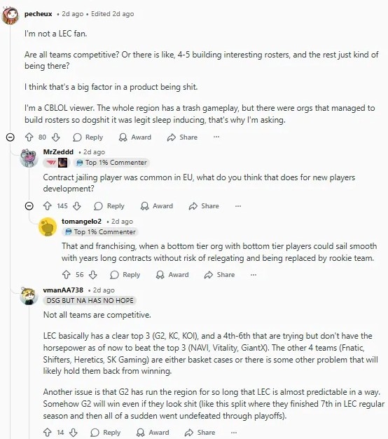 并不是所有队伍都有竞争力。LEC基本上有清晰的前三强(G2, KC, KOI),然后第4到第6名的队伍虽然在努力,但目前还没有足够的硬实力去击败前三名(NAVI, Vitality, GiantX)。剩下的4支队伍(Fnatic, Shifters, Heretics, SK Gaming)要么纯粹是毫无希望的烂摊子,要么就是存在一些其他大概率会阻碍他们赢下比赛的严重问题。另一个问题是,G2统治这个赛区实在太久了,以至于LEC在某种程度上变得毫无悬念。不知道为什么,就算G2看起来打得很垃圾他们最后也能赢(比如这个赛段,他们在LEC常规赛只排第7,然后到了季后赛突然就以全胜战绩夺冠了)。