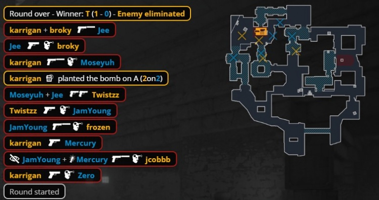 第4回合长枪局,Jee大狙黑屋先杀总监,FaZe四人转A下包,包点对枪FaZe二换三,残局2v2,大表哥捡到大狙轰掉Zero,Moseyuh打掉大表哥后以为自己没钳子,导致他捡钳子跑过头1.008s未能拆包,FaZe拿到第4分。