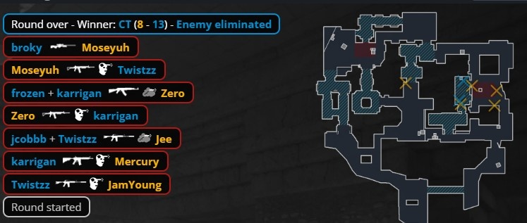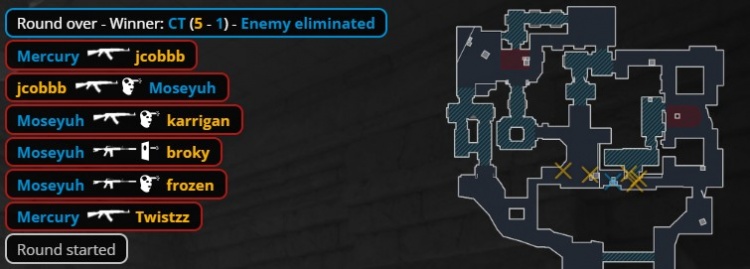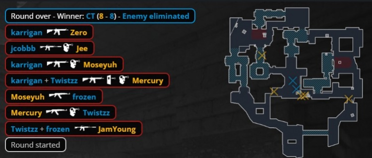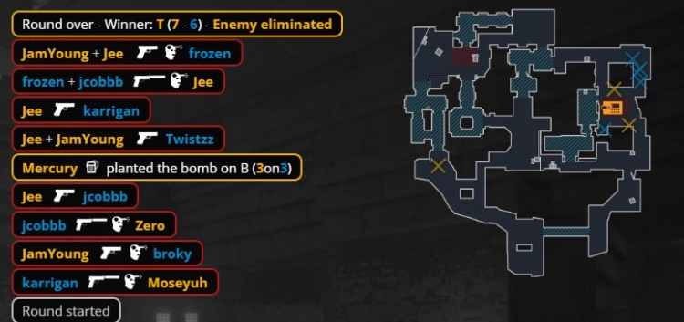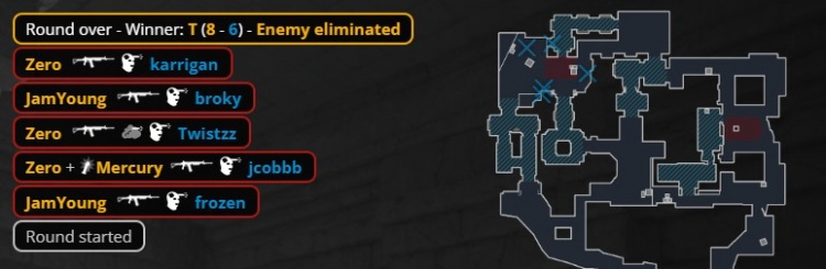 第8回合FaZe纯E匪家挂机,倒计时结束前FaZe冲B,Mercury特四杀,天禄拿到第3分。
