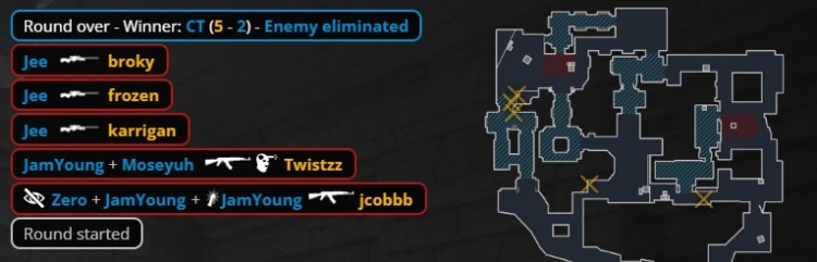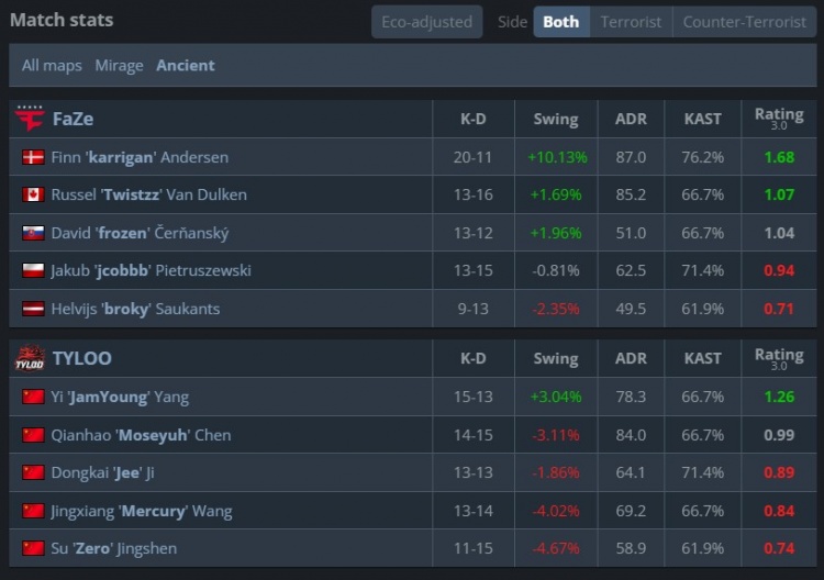 FaZe:karrigan、broky、Twistzz、jcobbb、frozen