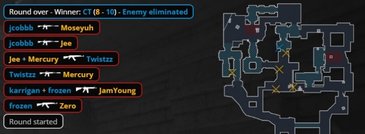 关键第18回合长枪局,寒王前顶A厅打掉Zero,FaZe放掉中路,小鞠与Jee走进甜甜圈,大表哥击杀小鞠,总监打掉中路的Mercury,Jee换掉总监,jcobbb双杀收尾,FaZe拿到第10分。
