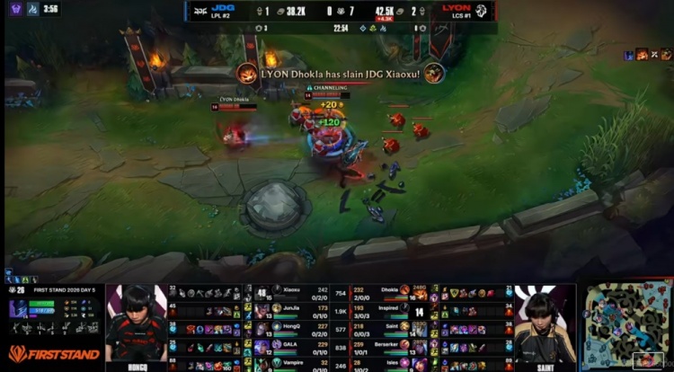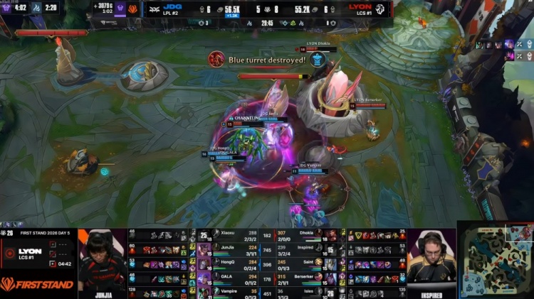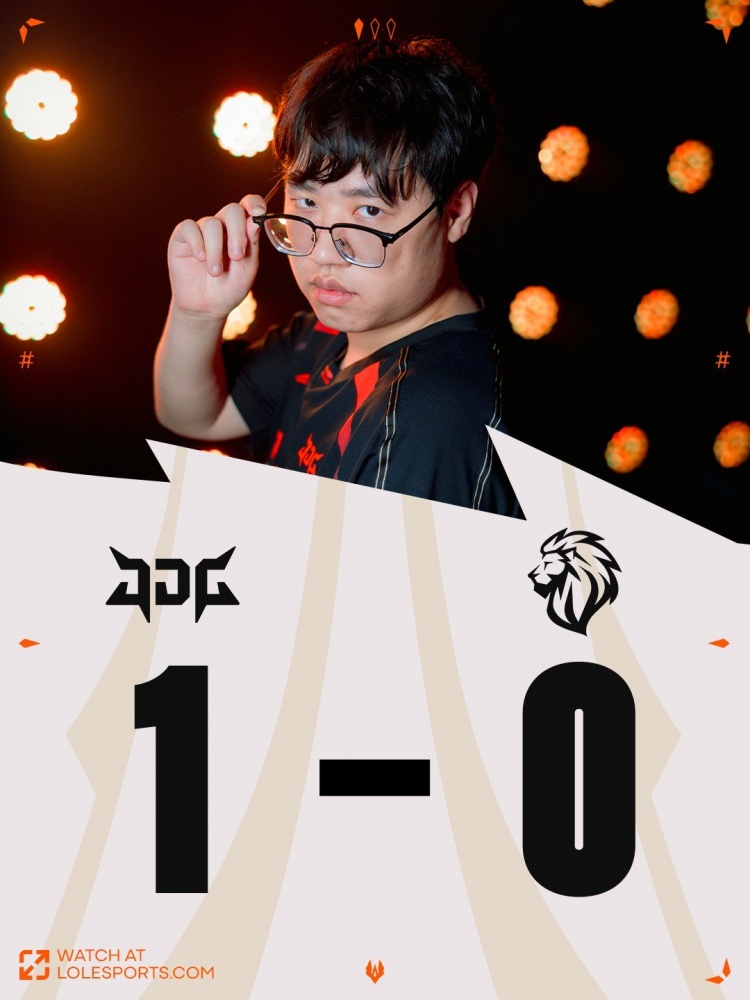 首局比赛LYON下路组打出压制,Inspired梦魇对位也压住了Junjia赵信,配合队友逮捕赵信拿下一血之后连续打出节奏!过了对线期Inspired梦魇大招好了就飞,xiaoxu鳄鱼和HongQ发条都被强杀,LYON一度打出击杀7-0开局+五千领先+三条小龙给足压力!但是关键的龙魂团Inspired梦魇开飞和加里奥脱节自己白给,JDG一波留人0换3之后拿下大龙!抹平经济差!随后LYON中路三包一被xiaoxu鳄鱼换掉了isles妮蔻,JDG四人推掉下路高地,Dhokla纳尔交TP回防为时已晚,JDG强杀加里奥之后一波结束比赛,翻盘拿下第一分!