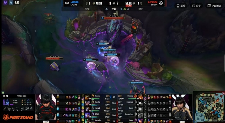 【8:48】JDG拿下三虫!随后Inspired梦魇再次关灯开飞,配合Saint加里奥在中路强杀掉了HongQ发条!LYON领先2K!随后LYON拿下第一条小龙!
