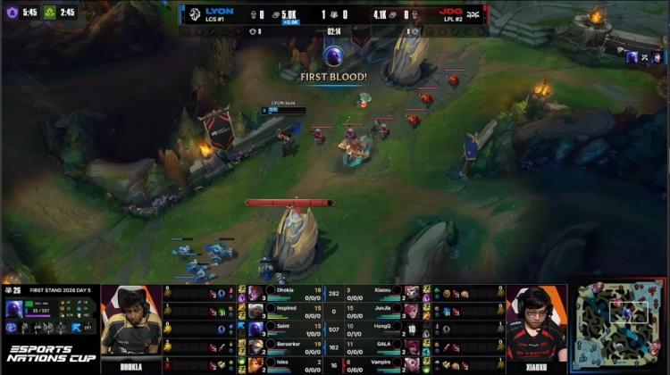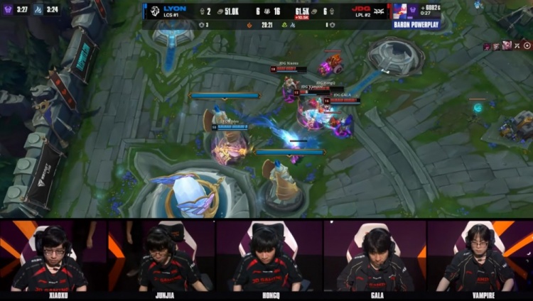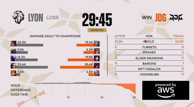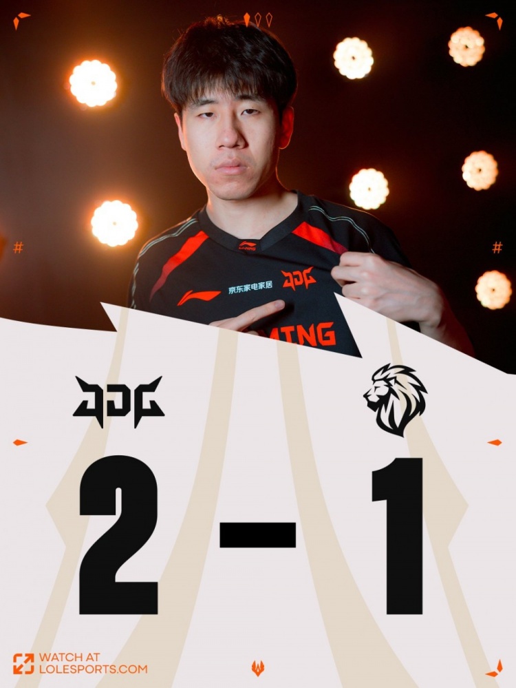 后期大龙团V神洛再开两人,Dhokla阿萝拉绕后走进包围圈送出人头,JDG打出0换2吃掉大龙经济领先6k。最终上野区GALA霞轻松双杀,徐神亚恒中路开大融化Dhokla,JDG打出0换5一波推平LYON基地拿到赛点。