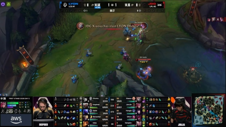 中期Berserker伊泽瑞尔吃线被JDG三人逮捕,徐神亚恒下路留住Saint瑞兹拿到人头,双方经济持平。小龙团LYON先锋牵制,JDG打出1换2,双方经济持平。上路团战V神洛魅惑两人,Inspired安蓓萨被控融化,JDG打出0换3经济领先接近3k。