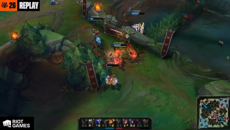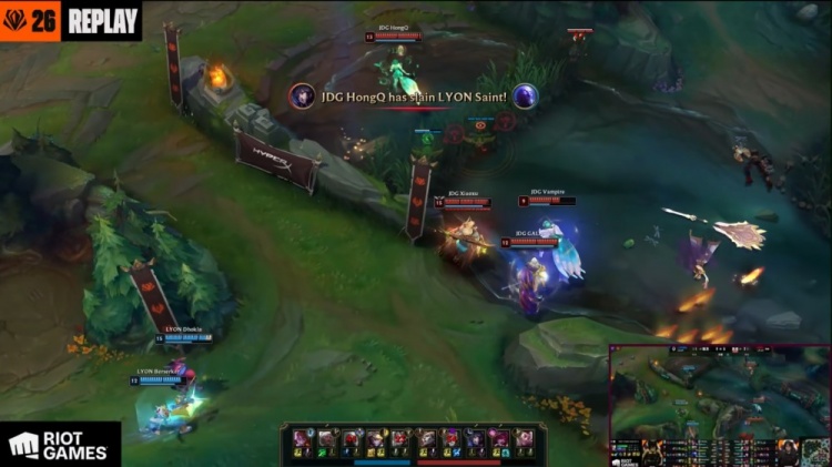【22:04】LYON吃掉小龙,本局为风龙魂,LYON推掉JDG中路一塔,双方经济持平。