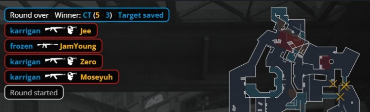 第3回合长枪局大表哥开场全白双杀,jcobbb与总监守住A点为FaZe拿到首分。第4回合broky在A大前顶击杀小鞠,随后Jee双杀带队进A下包拿到第3分。