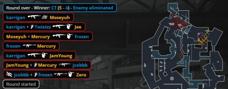 第6回合之前FaZe喊出暂停,暂停回来下水道总监先杀Zero,天禄慢打A点,jcobbb钻出烟雾弹打掉Mercury,天禄众人被团灭在厕所门口, FaZe拿到第5分。