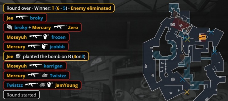 第24回合,寒王长管先被烫死,Jee大狙轰掉工地的jcobbb,总监与broky双人双杀扳平人数劣势,总监进B下包,broky大狙轰掉小鞠,mercury打掉大表哥,残局2v2,Moseyuh双杀拆包,天禄13-11拿下图三,大比分2-1淘汰FaZe!