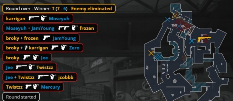 第16回合天禄纯E,FaZe五人来A,见面Moseyuh与小鞠双人沙鹰三杀,jcobbb与大表哥双人三杀对轰,Mercury打掉jcobbb后,大表哥带包转B下包,零皇与Mercury回防击杀大表哥后拆包,天禄手枪翻盘拿到第7分。