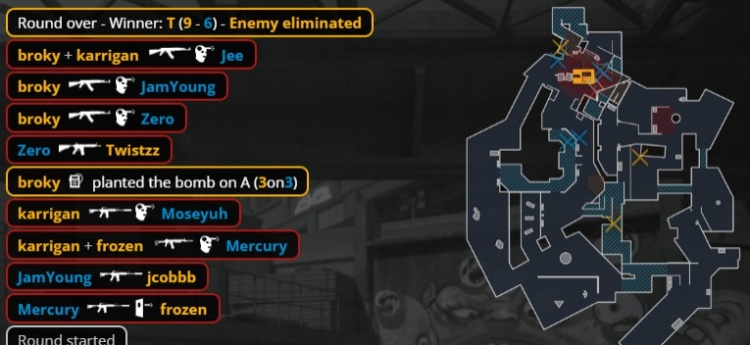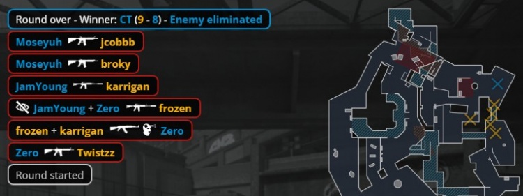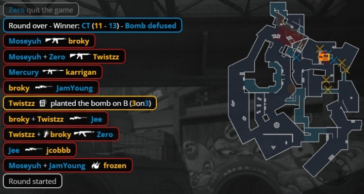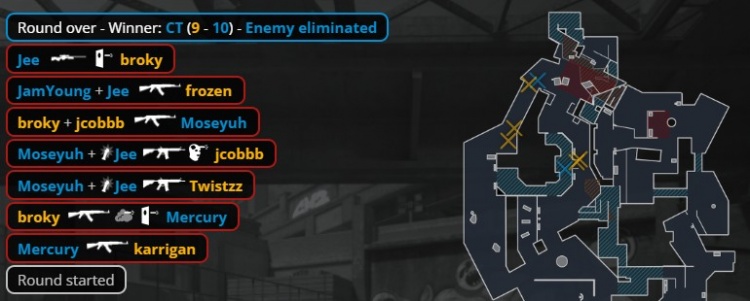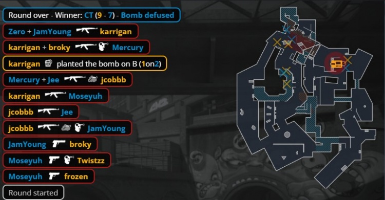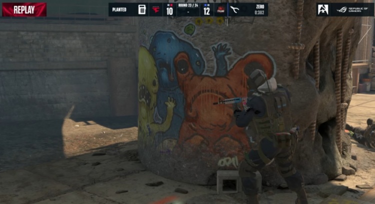 第23回合,厕所门口汉堡换掉总监,Jee被寒王手撕,Moseyuh换掉jcobbb,Zero打掉大表哥,broky进B下包,残局2v2,broky大狙轰掉小鞠,零皇0.382s没能拆包,FaZe拿到第11分。