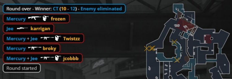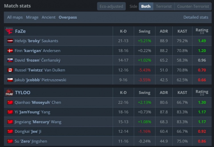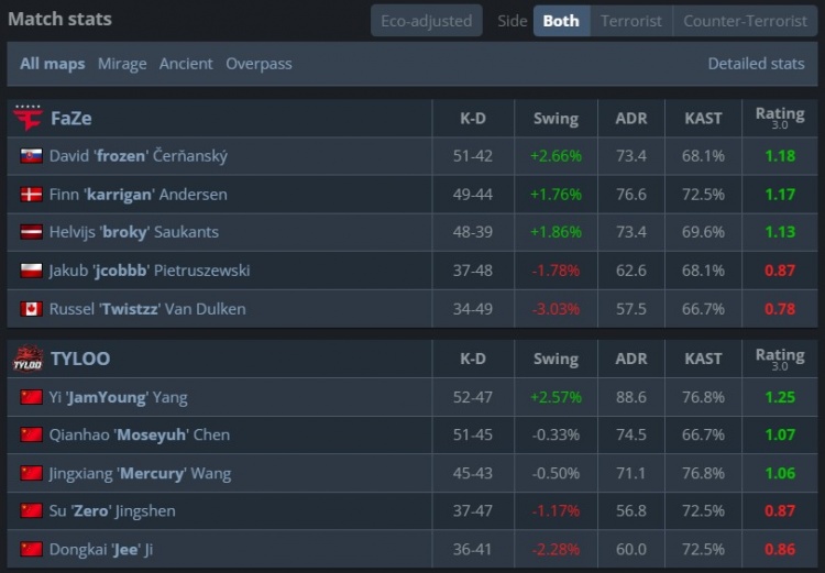 FaZe:karrigan、broky、Twistzz、jcobbb、frozen