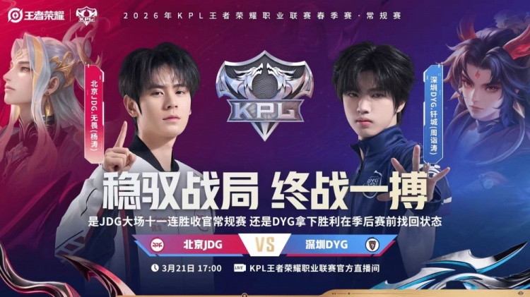 直播吧3月21日讯 2026KPL春季赛本场比赛是由北京JDG对阵到深圳DYG,面对无敌连胜的JDG,DYG能否拿下第三轮首分让我们一起期待!