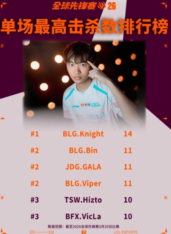单场最高击杀数排行榜中,Knight以14击杀数位列第一,Bin、GALA与Viper 以11击杀数并列第二。