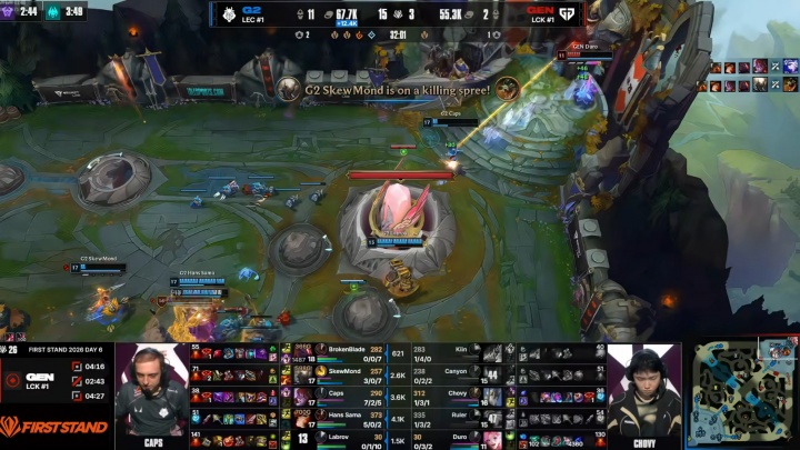 直播吧03月21日讯 2026巴西全球先锋赛Day6,G2在首局战胜GEN.G。