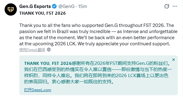 “感谢所有在2026年FST期间支持Gen.G的粉丝们。我们在巴西感受到的热情实在令人难以置信——那份激情与当下的热度一样炽烈,同样令人难忘。我们将在即将到来的2026 LCK赛场上以更出色的表现回归。衷心感谢大家一如既往的支持。 ”