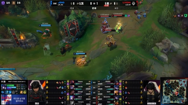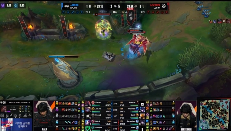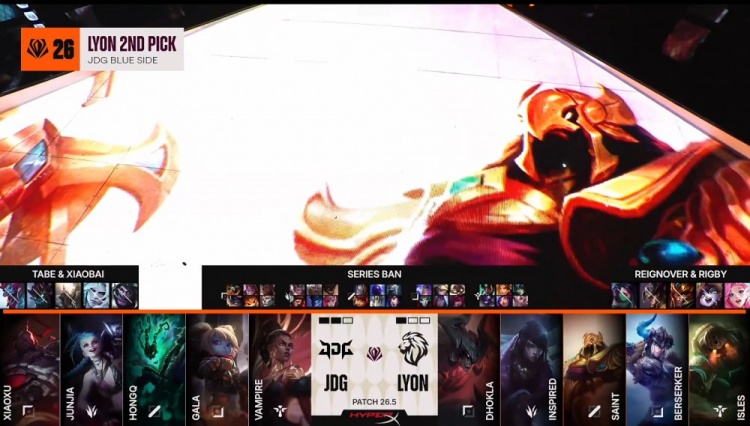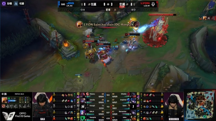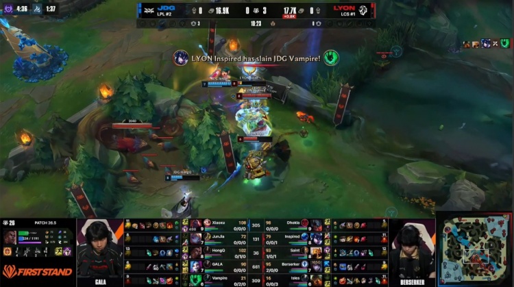 【26:09】中路团战,Saint沙皇闪现向前推空气送GALA金克丝启动,Junjia波比锤飞Dhokla剑魔,berserker厄斐琉斯闪现进JDG四人面前暴毙,Dhokla回到正面砍掉GALA金克丝,JDG打出1换2。