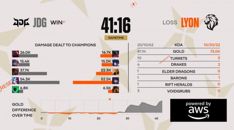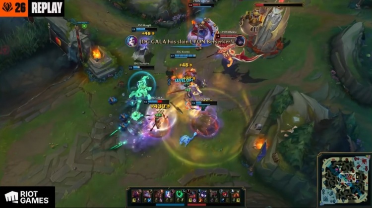 后期LYON放JDG连吃三条小龙,龙魂团GALA击杀Inspired小猪启动爆轰三杀,JDG团灭LYON后拿到纯种电龙魂,JDG经济领先6k。紧接着LYON搏命抢大龙得手,但终极老龙团,GALA爆轰三杀JDG融化LYON,JDG一波推平基地拿到比赛胜利。