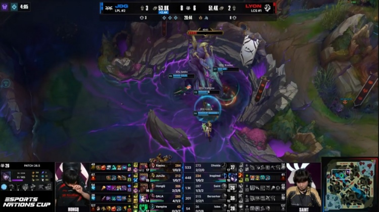 【28:39】LYON大龙逼团,GALA金克丝启动开杀,JDG打出0换4,吃掉大龙,经济领先3k。