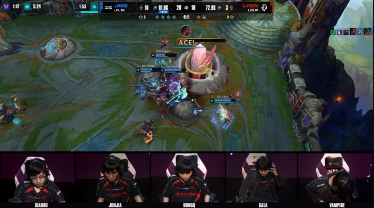 【19:30】中路JDG四打二,LYON众人支援到位,徐神赛恩开车撞人向后拉,Junjia波比开大锤飞Saint沙皇,双方交换技能拉开。